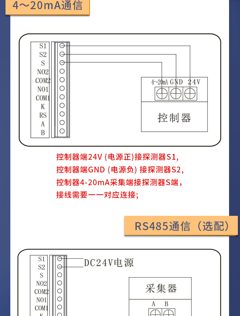 报警输出:声光报警输出50mA,2路可调继电器输出