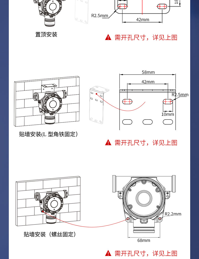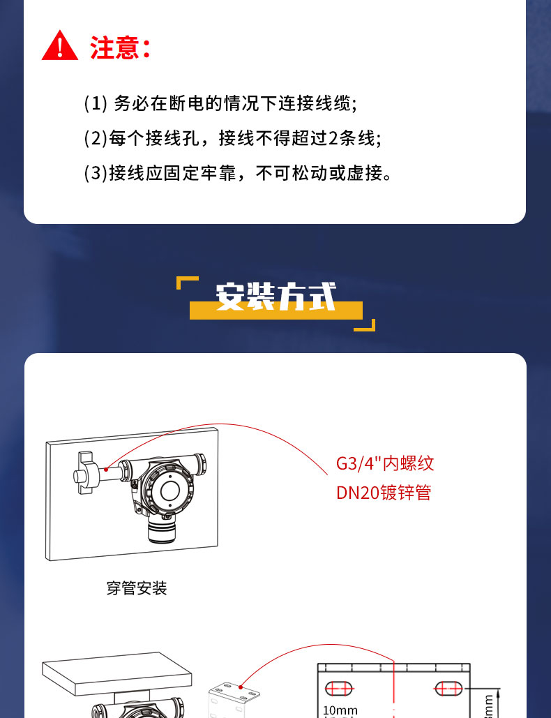 安装方式:穿管安装、置顶安装、贴墙安装(螺丝固定)、贴墙安装L型角铁固定)