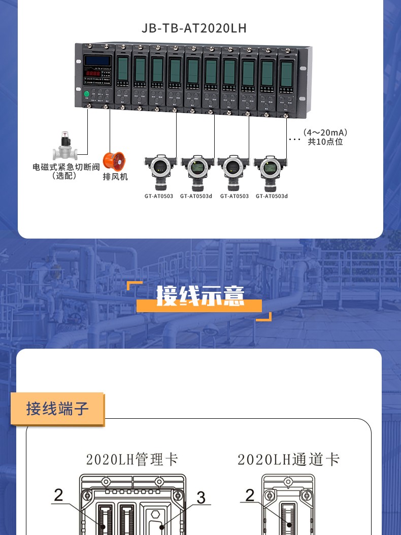 JB-TB-AT2020LH可燃气体报警控制器是由探测器与控制器组成的工业及商业用气安全监测系统的监控设备。将探测器安装于可能存在被测气体泄漏的危险场所;控制器安装在非防爆区域(控制室内)。当监测环境中有目标气体泄漏或液体挥发时,探测器经过识别、分析并将目标气体浓度转换为4~20mA信号发送给气体报警控制器,控制器接收处理后显示出被测气体浓度。当被测气体浓度达到或超过报警限值时,控制器将发出声光报警信号,并根据联动关系输出外控信号,启动相应被控设备,从而有效的保障安全生产、生活和预防气体大量泄漏带来的危险事故的发生。