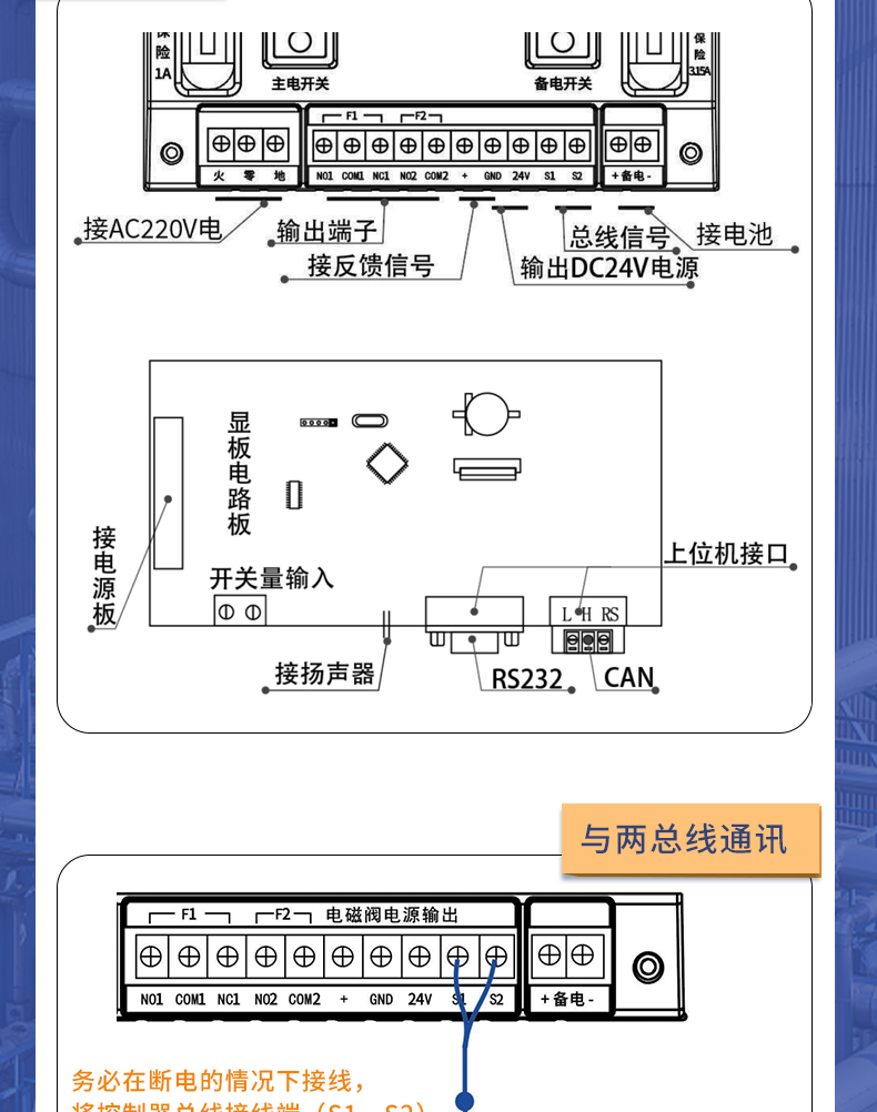 报警输出:2组无源可编程外控输出(触点容量AC220/1A或DC24/2A)